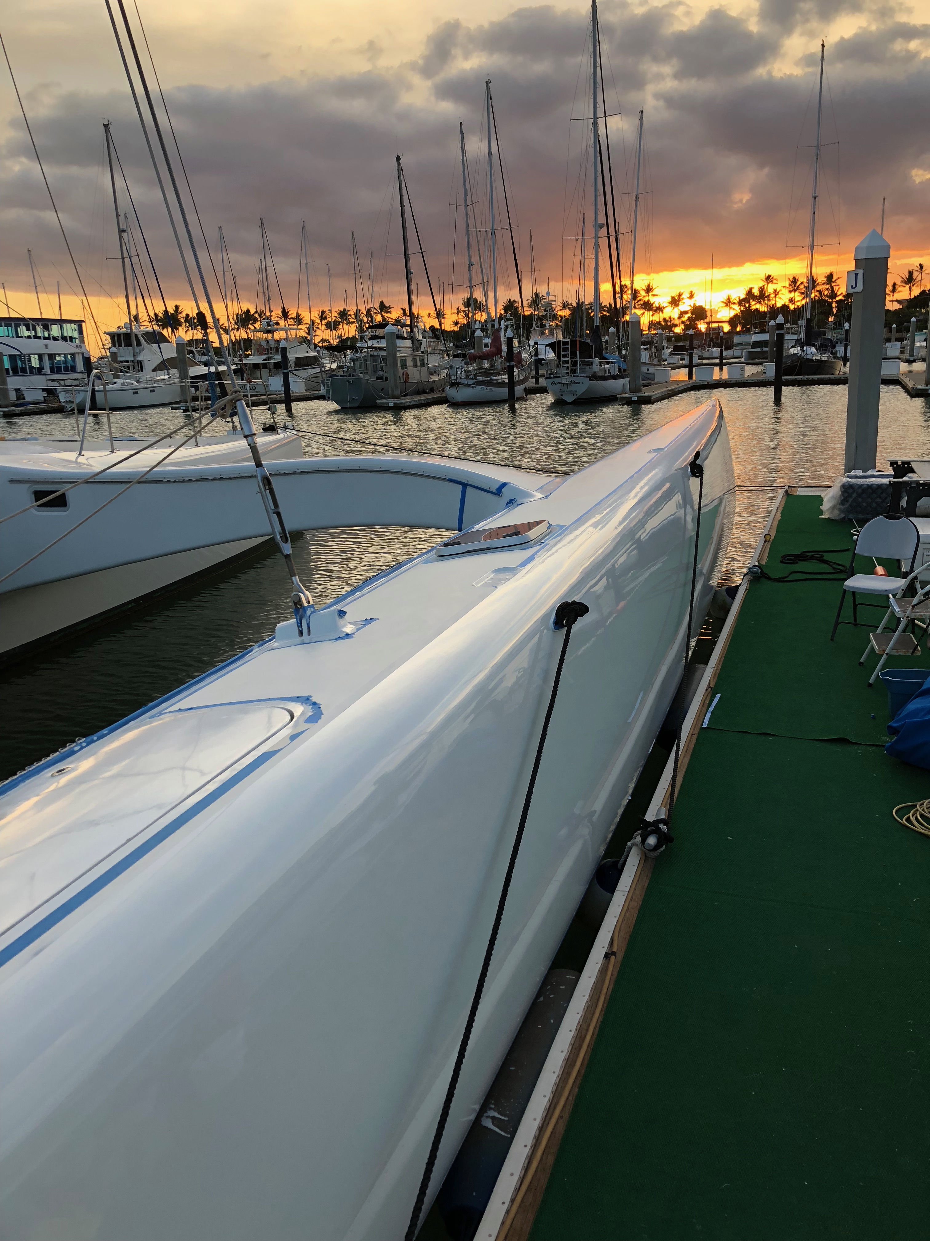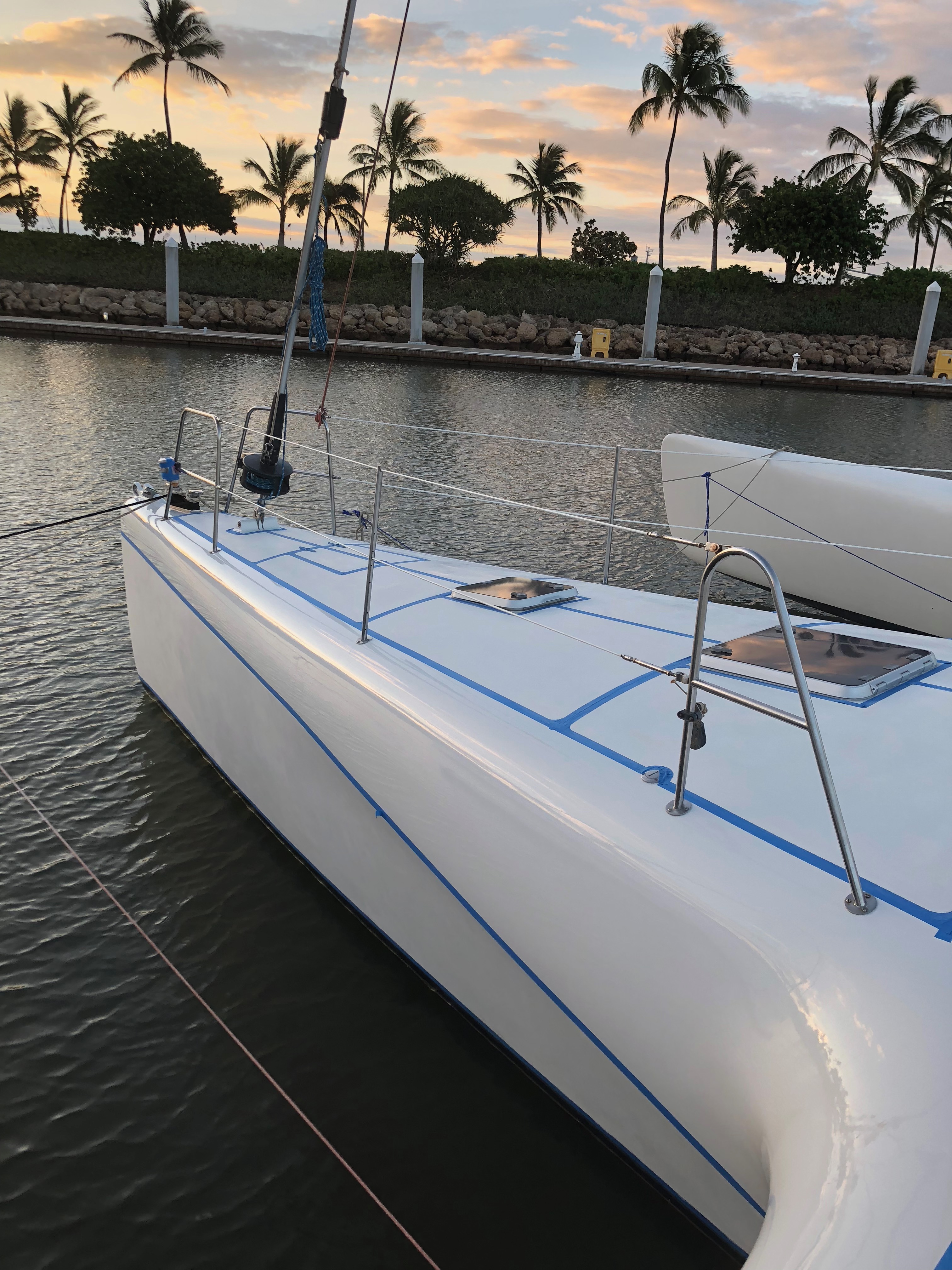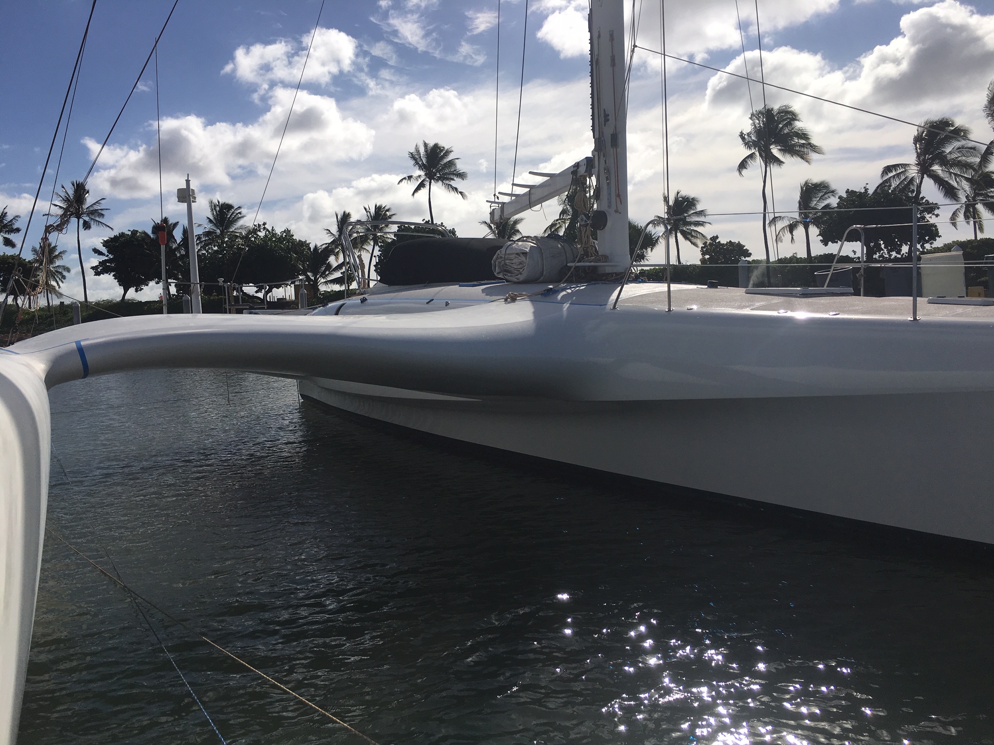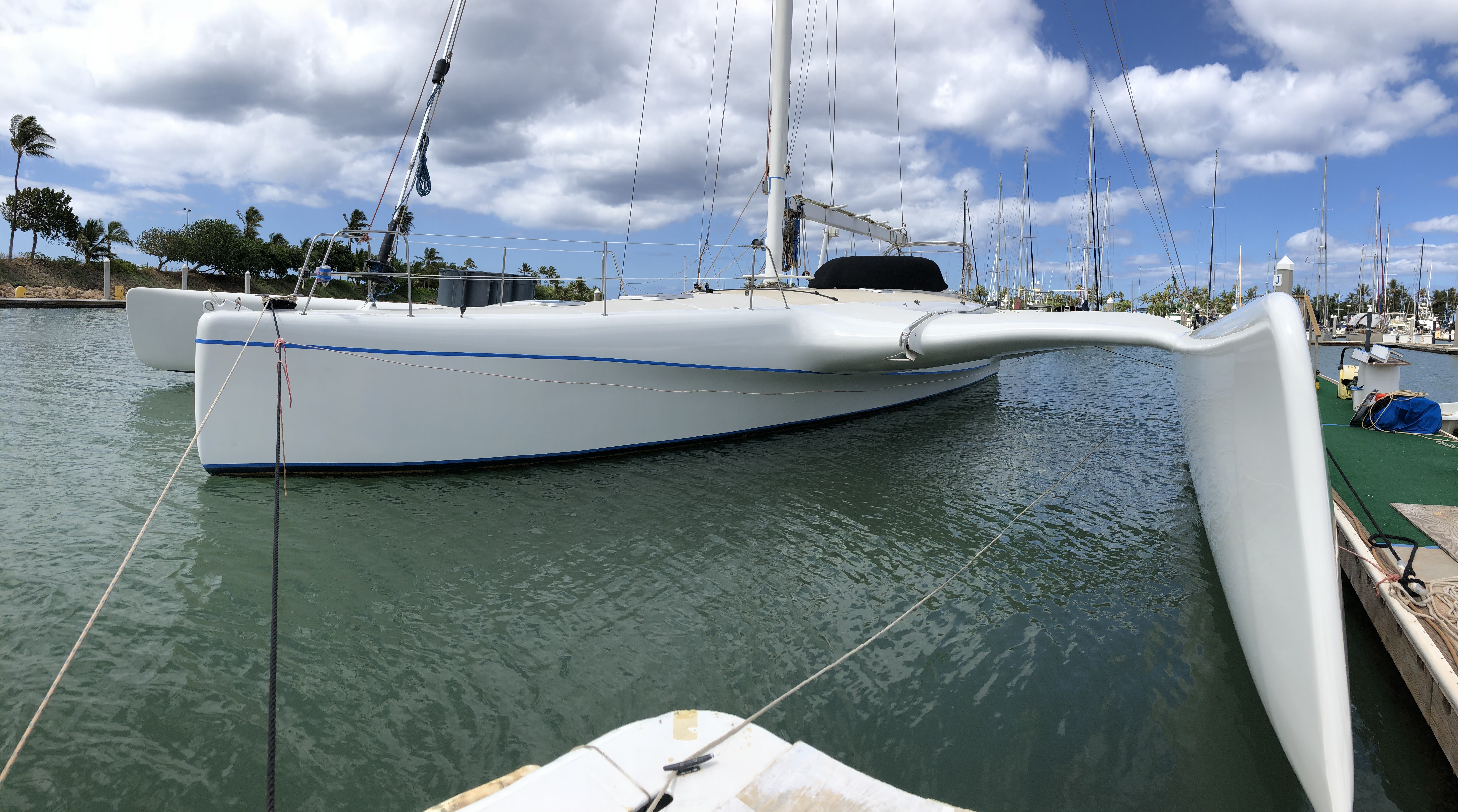 Hulls & Deck Hulls are painted with two coats of white Sterling linear polyurethane with a Copperpoxy bottom applied in the molds. This bottom finish is exceptionally smooth and provides antifouling for ten years or more. The tops of each ama, the main hull, and cross beams have a molded-in non-skid surface. Molded, recessed steps with stainless steel grab rails are aft and outboard in each ama for side-to boarding. Port and starboard amas are impressive both in their size and shape with their obvious purpose of providing buoyancy induced righting moments with minimal hydrodynamic drag. Two foot wide by four foot long access hatches in the top of each ama are hinged and secured with flush, “Whitlock” winch handle operated dogs. These hatches are fitted with gutters and overboard drains to keep water out. Watertight compartments following sacrificial foam bows are forward in each ama with large storage areas amidships. A propane locker is located in the starboard ama while a work bench/storage cabinet is in the port ama. Connecting the amas to the main hull are the forward and aft cross beams. These complex-curved beams are sculpted art forms of structural and aerodynamic engineering. With the boat at rest both amas rest in the water keeping her from rocking back and forth in an annoying way as found on many high performance trimarans. With the slightest breeze, the windward ama lifts clear of the water reducing wetted surface and drag. Black, nylon web netting measuring 14’ by 20’ is secured between the amas, main hull, and cross beams on each side. This provides a safe, fun area for lounging or playing on each side. Forward in the main hull is a large storage locker fitted with a guttered and drained opening secured with a “Whitlock” dog. A stainless steel ladder provides access in this space. Inside this locker are an overhead light, 12 volt DC outlet, electric bilge pump with float switch, and fresh and salt water wash-down connections. On deck a large mold-in padeye, lined with stainless steel, is furthest forward and ideal for tacking asymmetric spinnakers. Next aft is a molded in toggle connection for tacking furling code-zero’s or screachers. This is followed by a large stainless steel mooring bit. Double lifelines are secured forward to a walk- through stainless steel bow pulpit and run aft on each side through stanchions to the forward crossbeams. Stainless steel hand rails run continuously on each side along the transom steps up and along the aft cross beam. A 6’ 6” long cockpit is protected by an acrylic windscreen. This amazing structure is built of five separate compound curved acrylic panels, each requiring a custom mold to build. The steering pedestal, engine control panel, and all primary sailing controls are located at the cockpit. Aft of the cockpit eight wide steps descend down the transom to the water’s edge for easy dinghy, dock, or water access. A hold/cold fresh water shower is located on the transom.