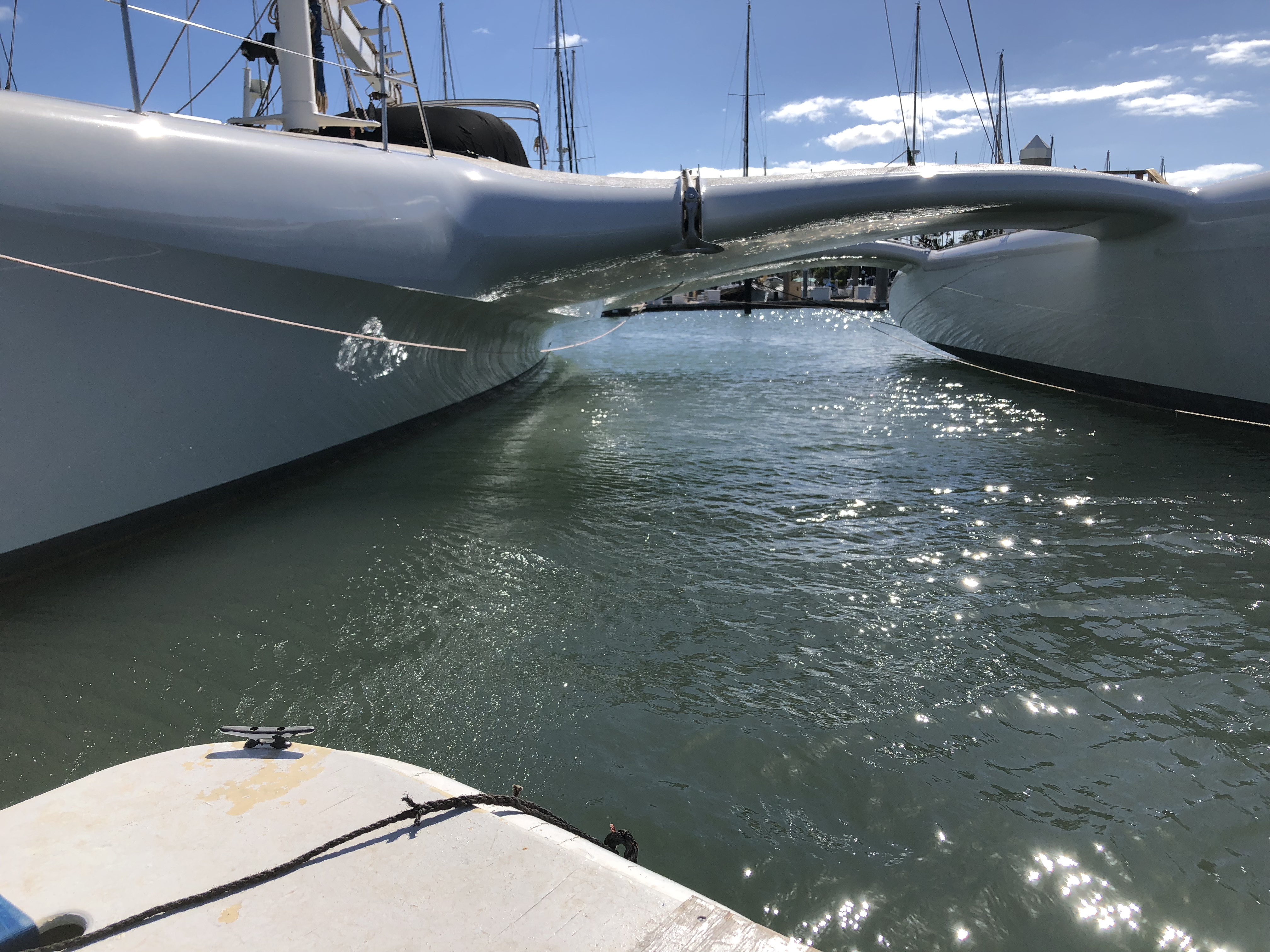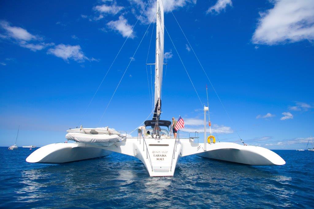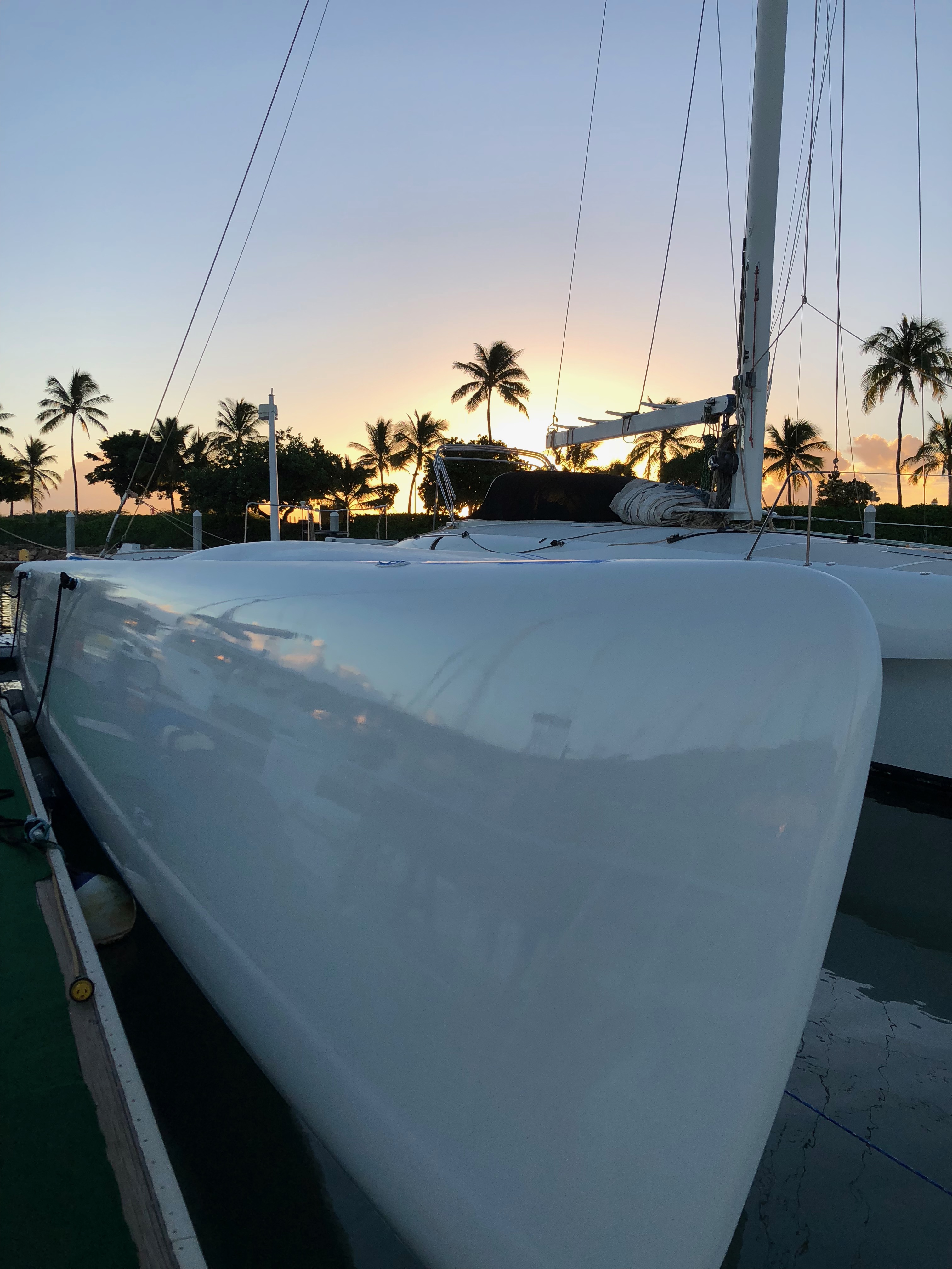 Hulls & Deck Hulls are painted with two coats of white Sterling linear polyurethane with a Copperpoxy bottom applied in the molds. This bottom finish is exceptionally smooth and provides antifouling for ten years or more. The tops of each ama, the main hull, and cross beams have a molded-in non-skid surface. Molded, recessed steps with stainless steel grab rails are aft and outboard in each ama for side-to boarding. Port and starboard amas are impressive both in their size and shape with their obvious purpose of providing buoyancy induced righting moments with minimal hydrodynamic drag. Two foot wide by four foot long access hatches in the top of each ama are hinged and secured with flush, “Whitlock” winch handle operated dogs. These hatches are fitted with gutters and overboard drains to keep water out. Watertight compartments following sacrificial foam bows are forward in each ama with large storage areas amidships. A propane locker is located in the starboard ama while a work bench/storage cabinet is in the port ama. Connecting the amas to the main hull are the forward and aft cross beams. These complex-curved beams are sculpted art forms of structural and aerodynamic engineering. With the boat at rest both amas rest in the water keeping her from rocking back and forth in an annoying way as found on many high performance trimarans. With the slightest breeze, the windward ama lifts clear of the water reducing wetted surface and drag. Black, nylon web netting measuring 14’ by 20’ is secured between the amas, main hull, and cross beams on each side. This provides a safe, fun area for lounging or playing on each side. Forward in the main hull is a large storage locker fitted with a guttered and drained opening secured with a “Whitlock” dog. A stainless steel ladder provides access in this space. Inside this locker are an overhead light, 12 volt DC outlet, electric bilge pump with float switch, and fresh and salt water wash-down connections. On deck a large mold-in padeye, lined with stainless steel, is furthest forward and ideal for tacking asymmetric spinnakers. Next aft is a molded in toggle connection for tacking furling code-zero’s or screachers. This is followed by a large stainless steel mooring bit. Double lifelines are secured forward to a walk- through stainless steel bow pulpit and run aft on each side through stanchions to the forward crossbeams. Stainless steel hand rails run continuously on each side along the transom steps up and along the aft cross beam. A 6’ 6” long cockpit is protected by an acrylic windscreen. This amazing structure is built of five separate compound curved acrylic panels, each requiring a custom mold to build. The steering pedestal, engine control panel, and all primary sailing controls are located at the cockpit. Aft of the cockpit eight wide steps descend down the transom to the water’s edge for easy dinghy, dock, or water access. A hold/cold fresh water shower is located on the transom.