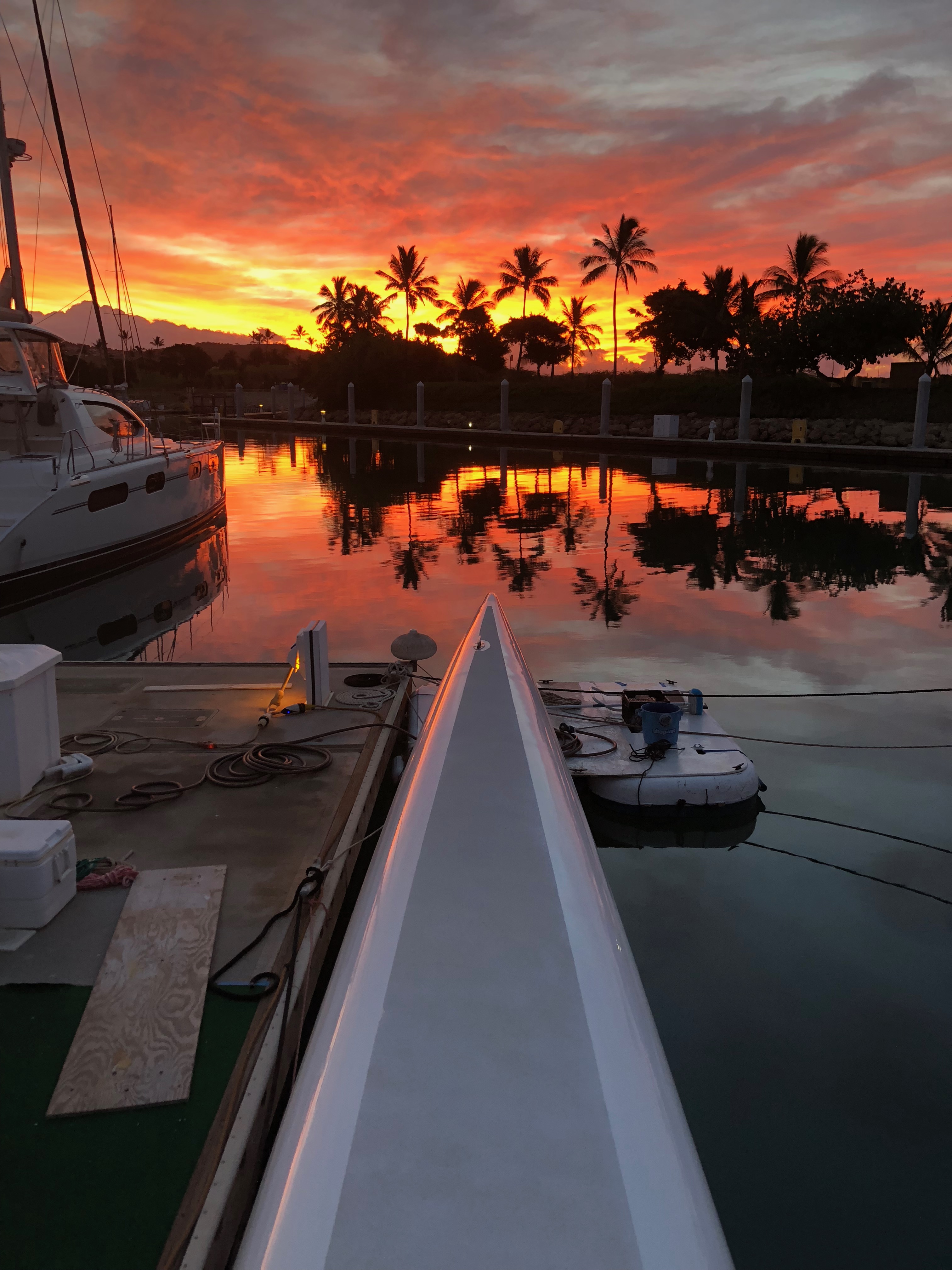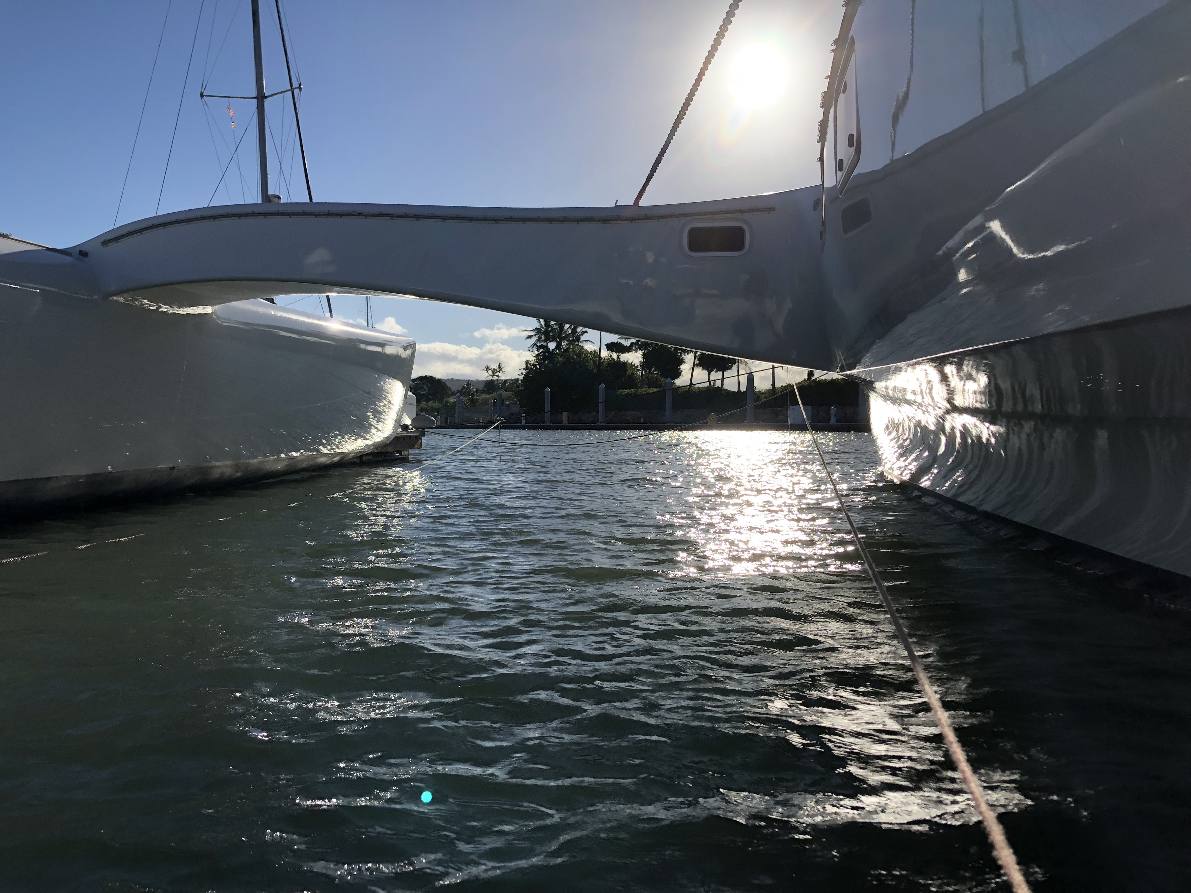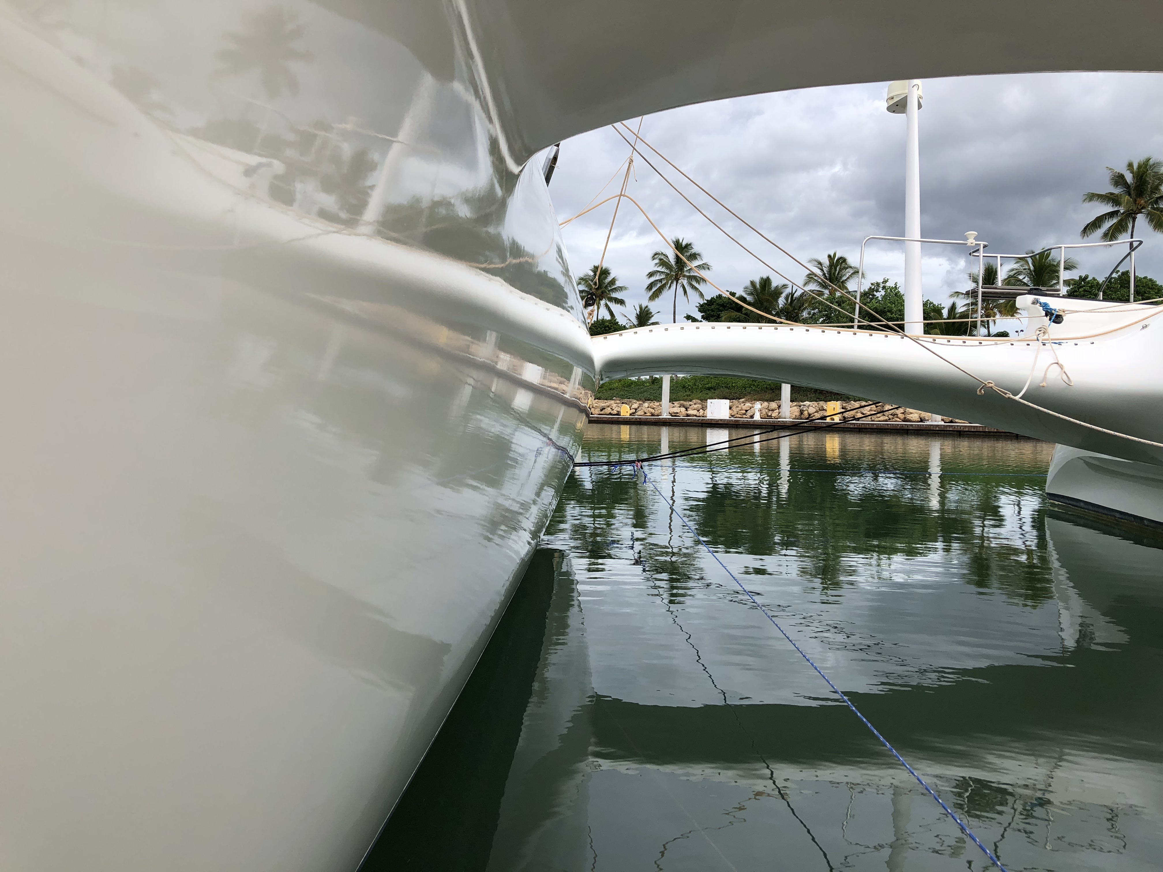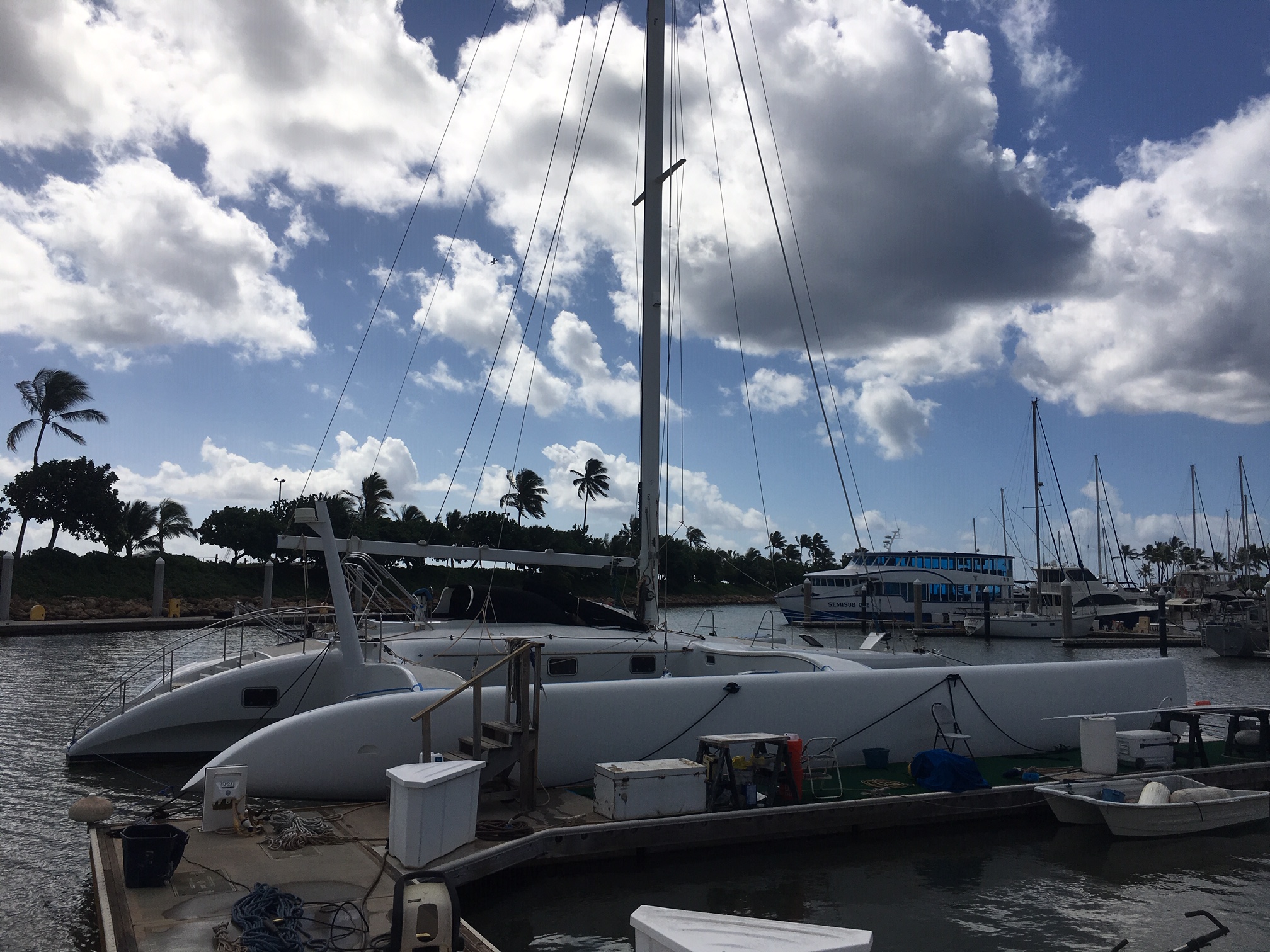 Hulls & Deck Hulls are painted with two coats of white Sterling linear polyurethane with a Copperpoxy bottom applied in the molds. This bottom finish is exceptionally smooth and provides antifouling for ten years or more. The tops of each ama, the main hull, and cross beams have a molded-in non-skid surface. Molded, recessed steps with stainless steel grab rails are aft and outboard in each ama for side-to boarding. Port and starboard amas are impressive both in their size and shape with their obvious purpose of providing buoyancy induced righting moments with minimal hydrodynamic drag. Two foot wide by four foot long access hatches in the top of each ama are hinged and secured with flush, “Whitlock” winch handle operated dogs. These hatches are fitted with gutters and overboard drains to keep water out. Watertight compartments following sacrificial foam bows are forward in each ama with large storage areas amidships. A propane locker is located in the starboard ama while a work bench/storage cabinet is in the port ama. Connecting the amas to the main hull are the forward and aft cross beams. These complex-curved beams are sculpted art forms of structural and aerodynamic engineering. With the boat at rest both amas rest in the water keeping her from rocking back and forth in an annoying way as found on many high performance trimarans. With the slightest breeze, the windward ama lifts clear of the water reducing wetted surface and drag. Black, nylon web netting measuring 14’ by 20’ is secured between the amas, main hull, and cross beams on each side. This provides a safe, fun area for lounging or playing on each side. Forward in the main hull is a large storage locker fitted with a guttered and drained opening secured with a “Whitlock” dog. A stainless steel ladder provides access in this space. Inside this locker are an overhead light, 12 volt DC outlet, electric bilge pump with float switch, and fresh and salt water wash-down connections. On deck a large mold-in padeye, lined with stainless steel, is furthest forward and ideal for tacking asymmetric spinnakers. Next aft is a molded in toggle connection for tacking furling code-zero’s or screachers. This is followed by a large stainless steel mooring bit. Double lifelines are secured forward to a walk- through stainless steel bow pulpit and run aft on each side through stanchions to the forward crossbeams. Stainless steel hand rails run continuously on each side along the transom steps up and along the aft cross beam. A 6’ 6” long cockpit is protected by an acrylic windscreen. This amazing structure is built of five separate compound curved acrylic panels, each requiring a custom mold to build. The steering pedestal, engine control panel, and all primary sailing controls are located at the cockpit. Aft of the cockpit eight wide steps descend down the transom to the water’s edge for easy dinghy, dock, or water access. A hold/cold fresh water shower is located on the transom.
